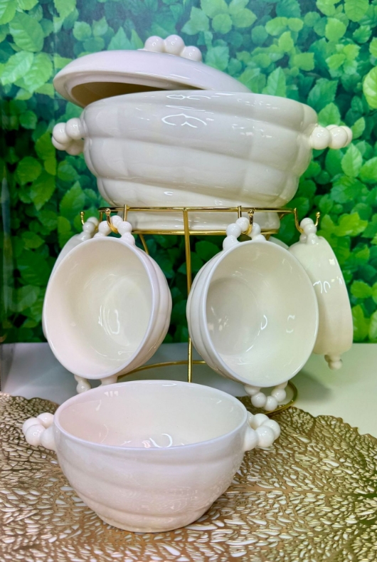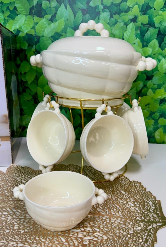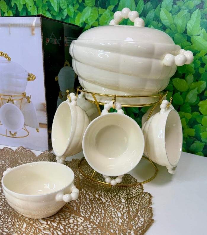 - ✅ Täielik komplekt: Supikauss, 6 kaussi ja elegantne kuldne alus.