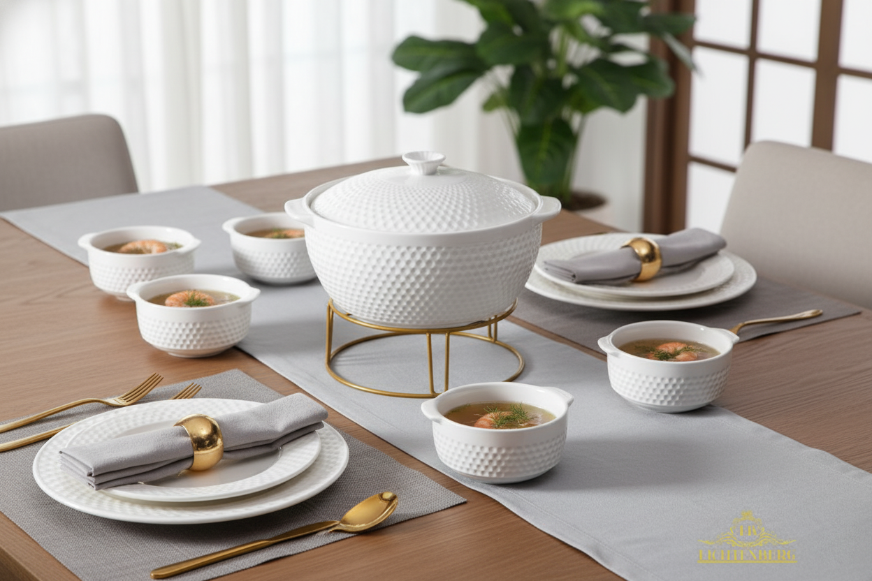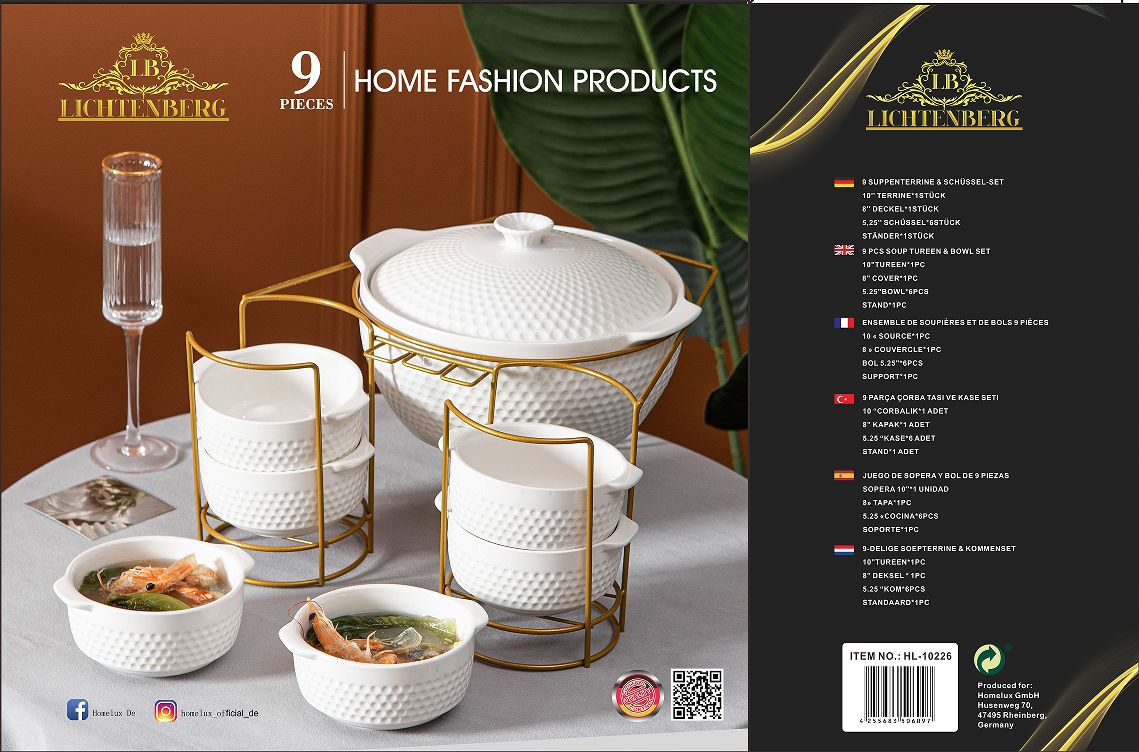 Lisage oma lauale luksust selle Lichtenbergi “Home Fashion Products” komplektiga. Komplekt on loodud elegantseks supi või hautise serveerimiseks. Komplekti kuulub suur 13-tolline (≈33 cm) supikauss koos 8-tollise (≈20 cm) kaanega, kuus 5.25-tollist (≈13.3 cm) kaussi ja elegantne kuldne metallist alus suurele supikausile.
