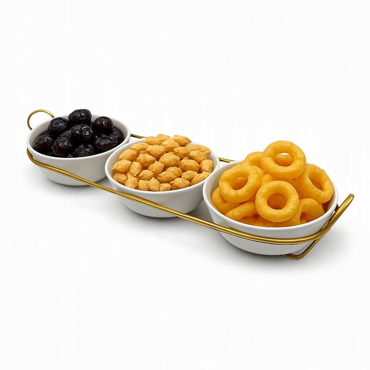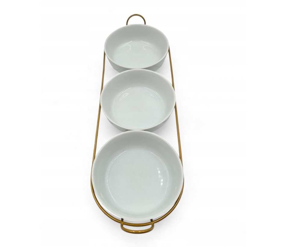 See stiilne kolmest ümarast portselankaussist koosnev komplekt ühtsel metallalusel sobib suurepäraselt erinevate kastmete, suupistete, pähklite, kuivatatud puuviljade või maiustuste serveerimiseks. Iga komplekt koosneb kolmest 4,5-tollisest (umbes 12 cm) valgest ümmargusest portselankausist ja ühest elegantsest kuldse värvi metallalusest, mis ühendab kõiki kausse.