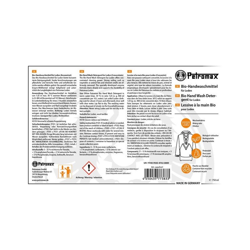 Petromax orgaaniline pesuvahend (Organic Hand Wash Loden) on universaalne ja tõhus toode, mis sobib villaste rõivaste (sealhulgas Loden villa) pesemiseks. See pesuvahend on valmistatud looduslikest, orgaanilistest koostisosadest, tagades õrna, kuid tõhusa puhastuse.