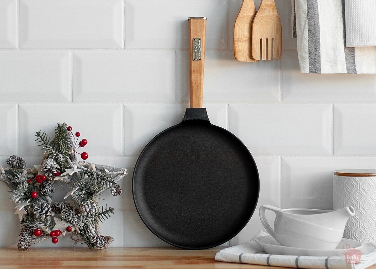 - Eemaldatav käepide: Puitkäepide on mugav, kuid ka eemaldatav, mis lihtsustab panni hoiustamist või kasutamist ahjus (ilma käepidemeta).