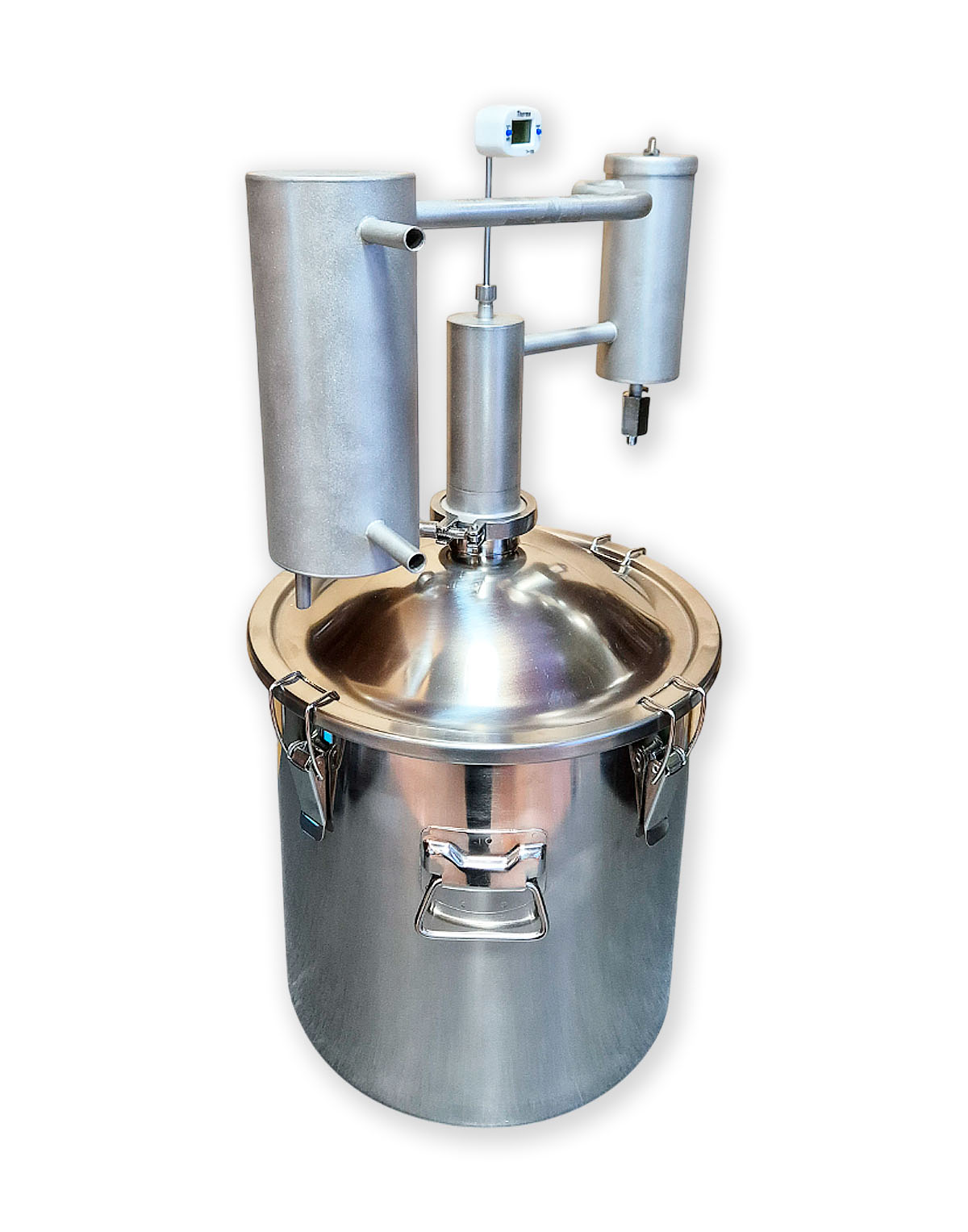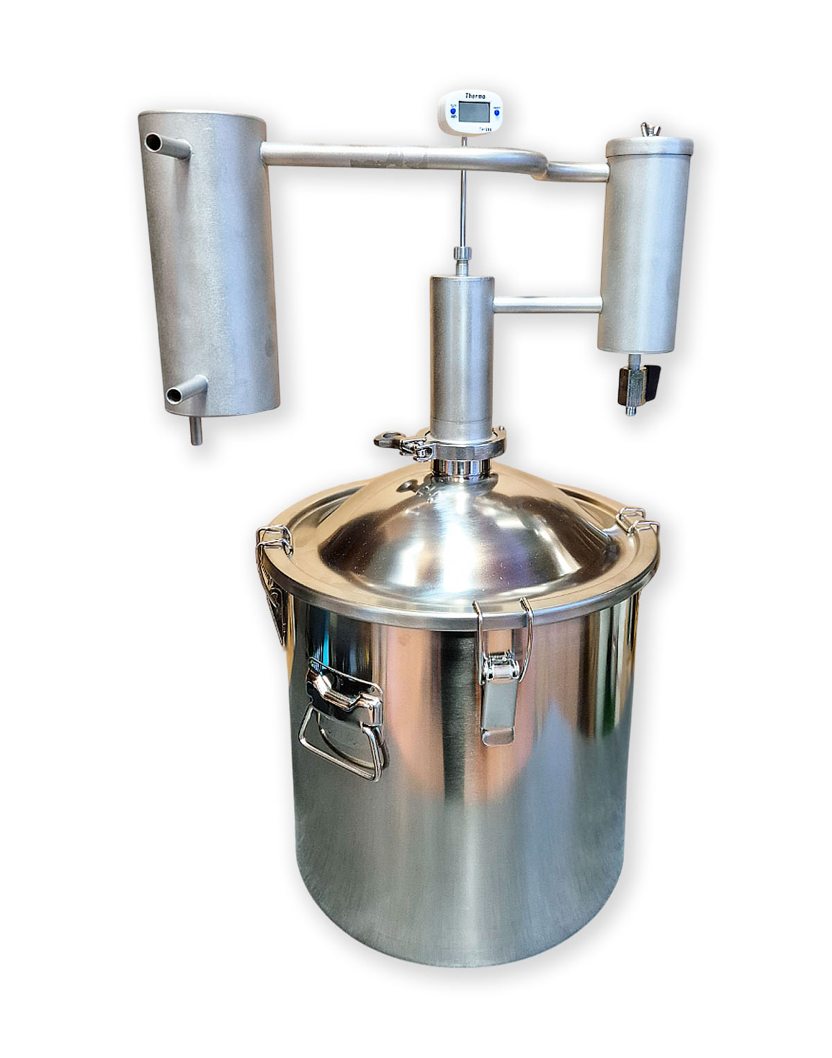 2) Kuppelkaane ja 2″ klamberühendusega (rangühendusega) 14 l destillatsioonikatel (-anum). Valmistatud roostevabast terasest AISI 304 (seinad ja kaas), AISI 430 (põhi);