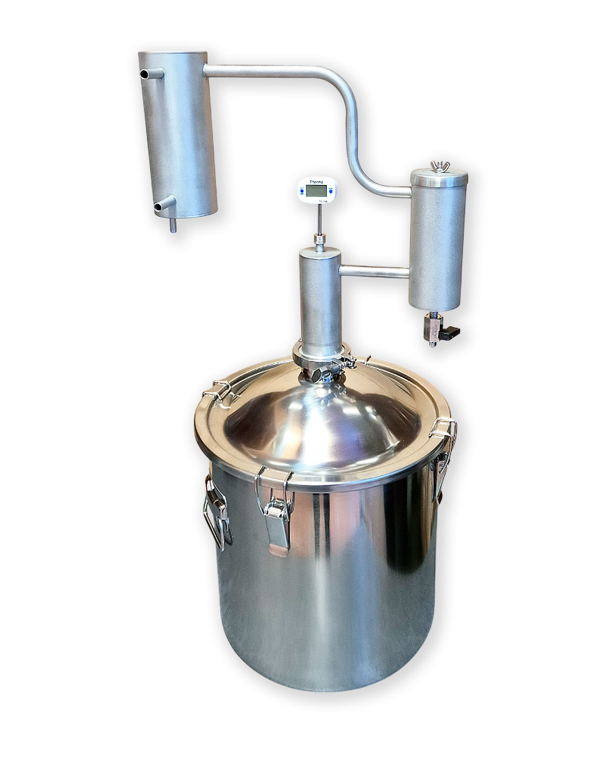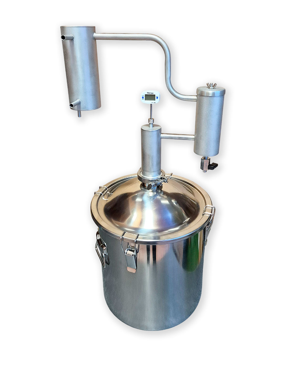 2) Kuppelkaane ja 2″ klamberühendusega (rangühendusega) 21 l destillatsioonikatel (-anum). Valmistatud roostevabast terasest AISI 304 (seinad ja kaas), AISI 430 (põhi);