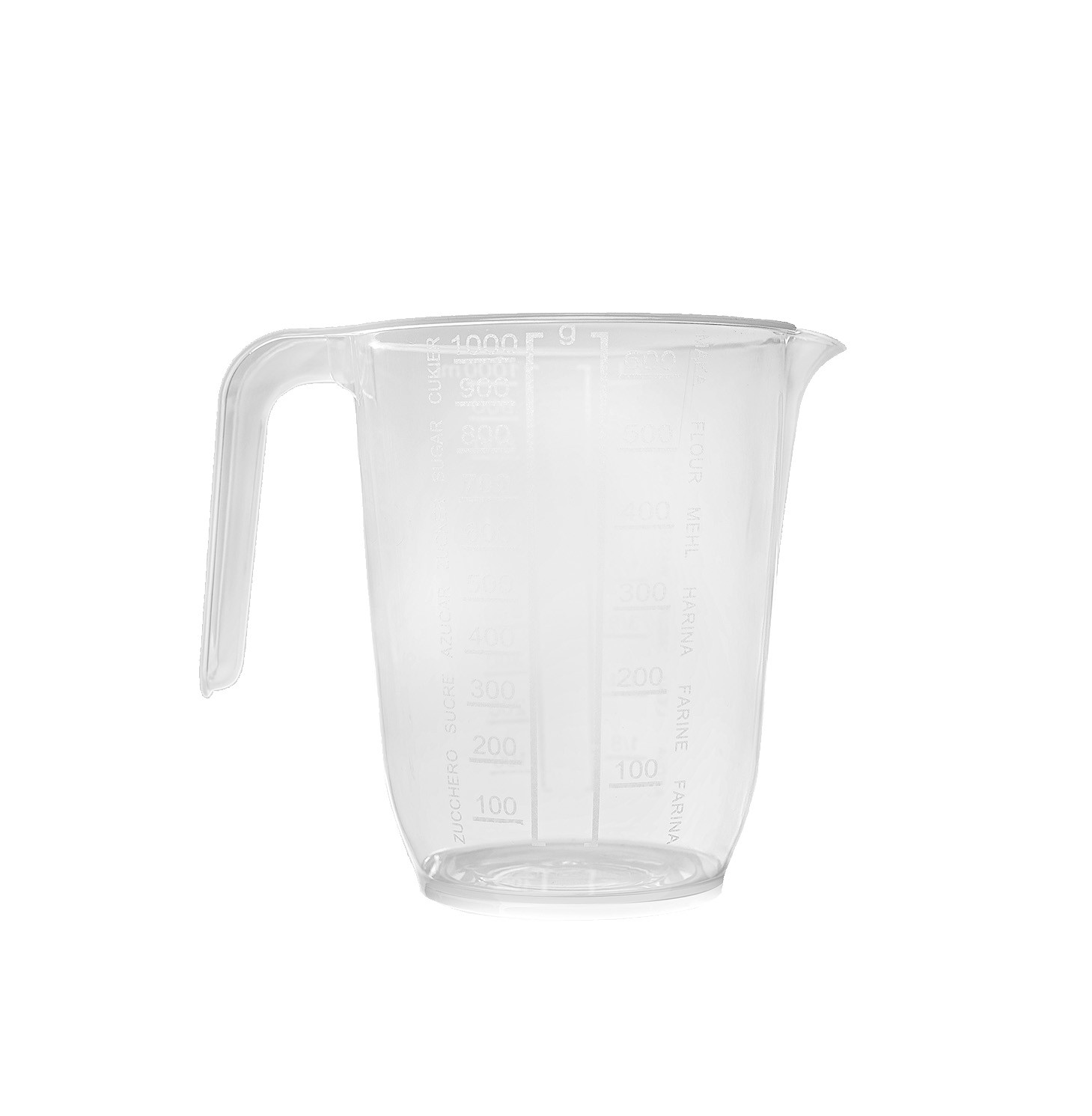 1L mahutavusega plastikust mõõtekann, mis on mõeldud vedelike ja puistekaupade mõõtmiseks.