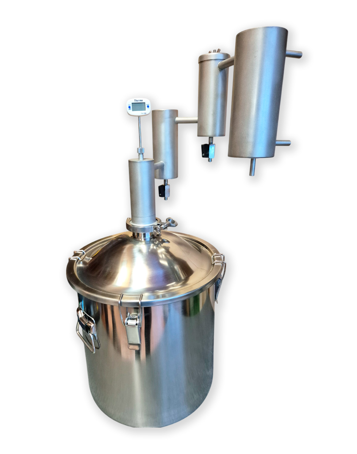 2) Kuppelkaane ja 2″ klamberühendusega (rangühendusega) 14 l destillatsioonikatel (-anum). Valmistatud roostevabast terasest AISI 304 (seinad ja kaas), AISI 430 (põhi);