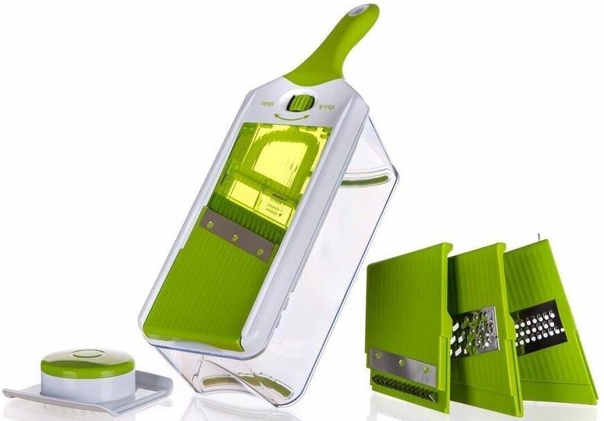 - Konteiner: Lõigatud tooted kukuvad otse plastkaussi. See hoiab ära segaduse tööpinnale ja hõlbustab ettevalmistatud toidu transportimist.