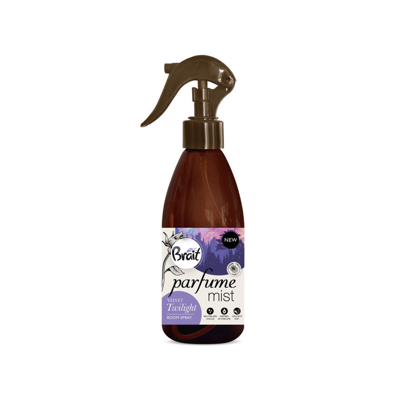 Brait “Parfumed Mist” – tai daugiau nei oro gaiviklis. Tai prabangi, kvapni dulksna, sukurta kaip kvepalai Jūsų namams. “Velvet Twilight” kompozicija sukuria jausmingą ir romantišką atmosferą, primenančią pasivaikščiojimą po žydintį sodą leidžiantis saulei. Ji efektyviai neutralizuoja nemalonius kvapus, drėkina orą ir palieka ilgai išliekantį, prabangų aromatą.