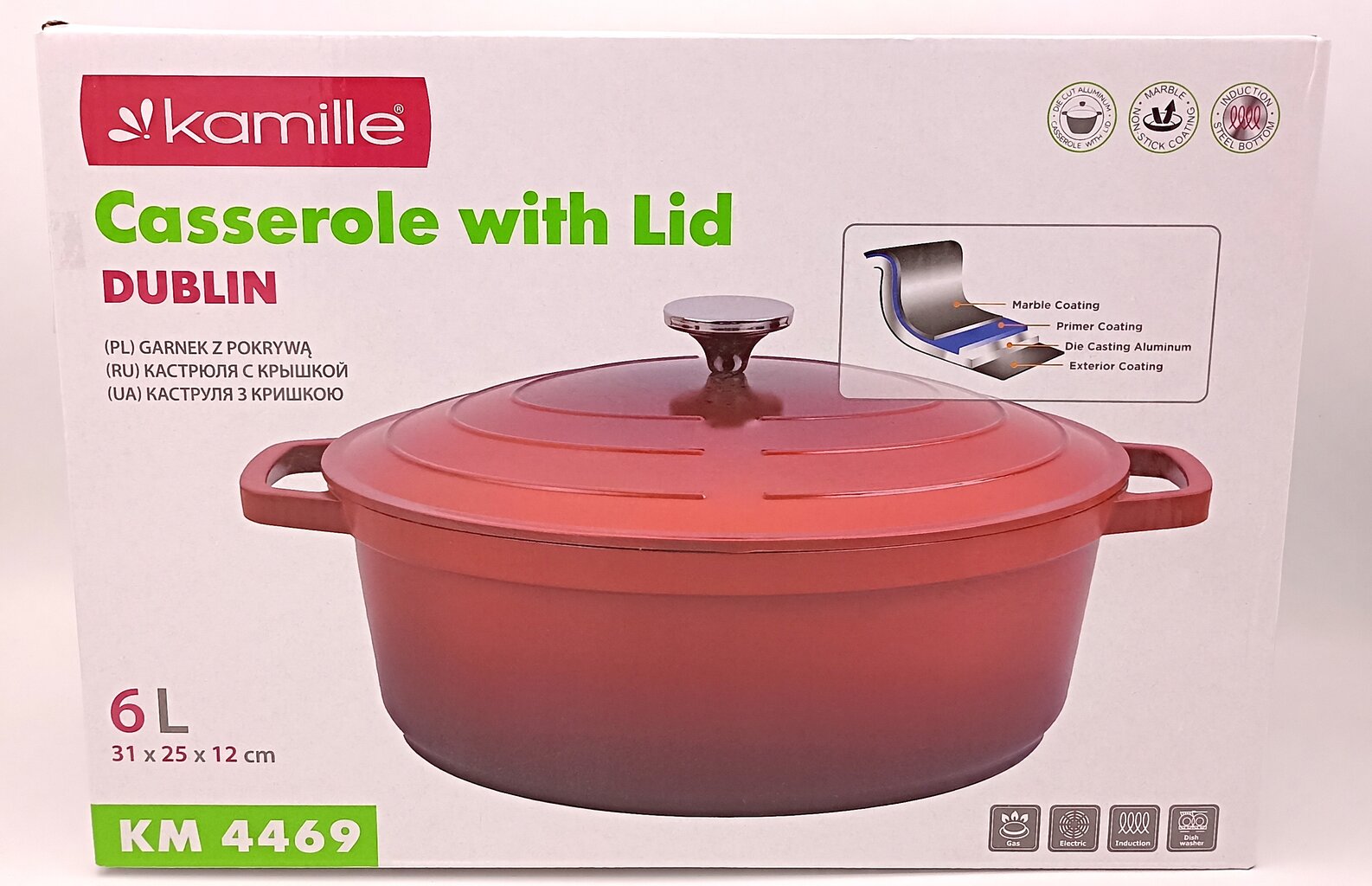 See ovaalne 6-liitrine pott “Kamille Dublin” sarjast on universaalne nõu, mis sobib suurepäraselt suurte pereõhtusöökide valmistamiseks. Tänu oma ovaalsele kujule ja suurele mahutavusele sobib see ideaalselt linnuliha (nt pardi või kana), praadide, köögiviljahautiste või kalaroogade valmistamiseks.