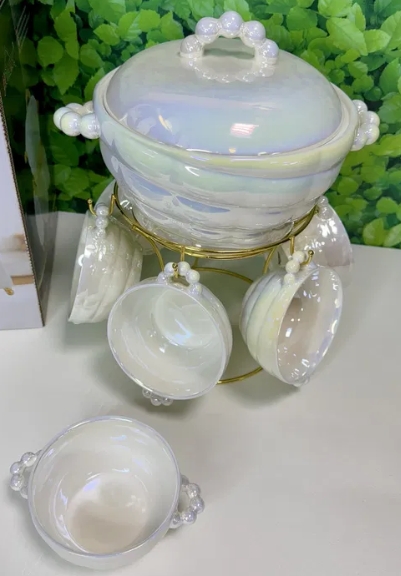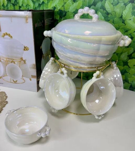 Tutvustame mitte ainult nõudekomplekti, vaid tõelist laua kaunistust – “Pärl”. See serveerimiskomplekt paistab silma oma unikaalse pärlmutterläikega, mis õrnalt muudab toone sõltuvalt valgustusest. See on loodud selleks, et muuta teie pidustused veelgi meeldejäävamaks ja anda igapäevastele lõunasöökidele luksuslik tunne.