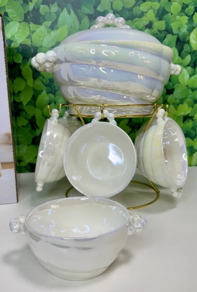 - ✅ Täielik komplekt: Supikauss, 6 kaussi ja elegantne kuldse värvusega alus.