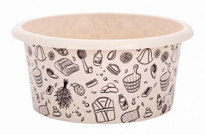 See 10-liitrine plastkauss paistab silma mitte ainult oma praktilisuse, vaid ka temaatilise disaini poolest. Kaunistatud hubaste sauna- ja vannitarvikute piltidega (vihad, rätikud, seep), sobib see suurepäraselt kasutamiseks saunas, pesu leotamiseks või lihtsalt stiilse majapidamisnõuna.