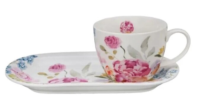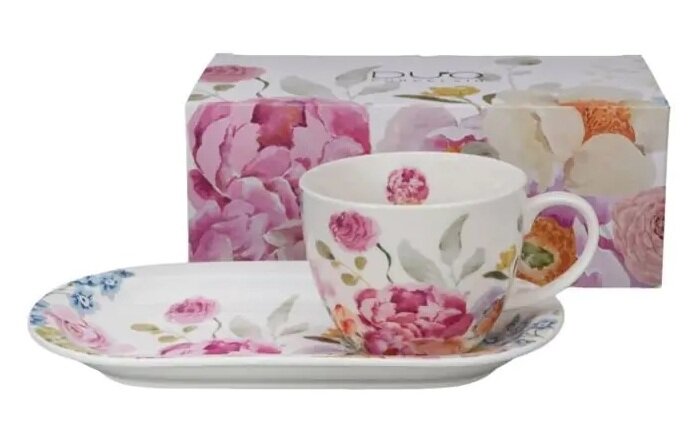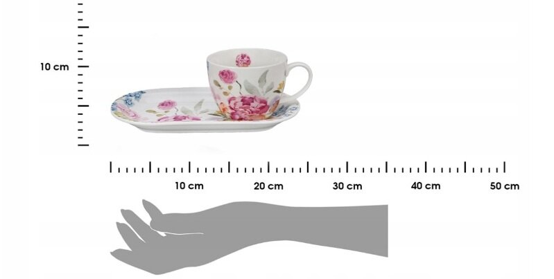 - Romantiline disain: Nõud on kaunistatud peenes, naiselikus stiilis – pastelsete pojengide ja rooside õied annavad komplektile kevadise värskuse ja kerguse tunde.