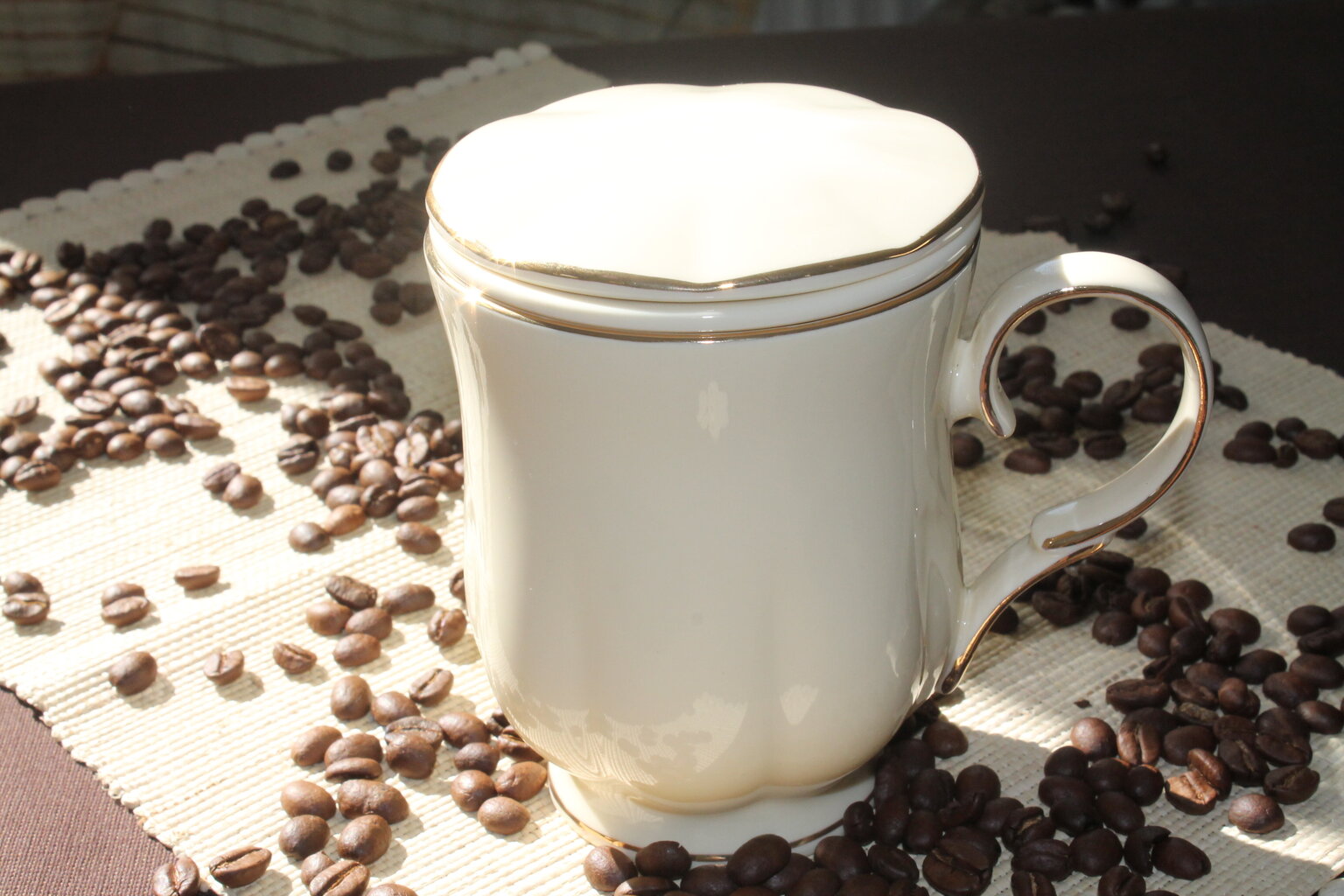 - Komplektis: Kruus, sõel, kaas.