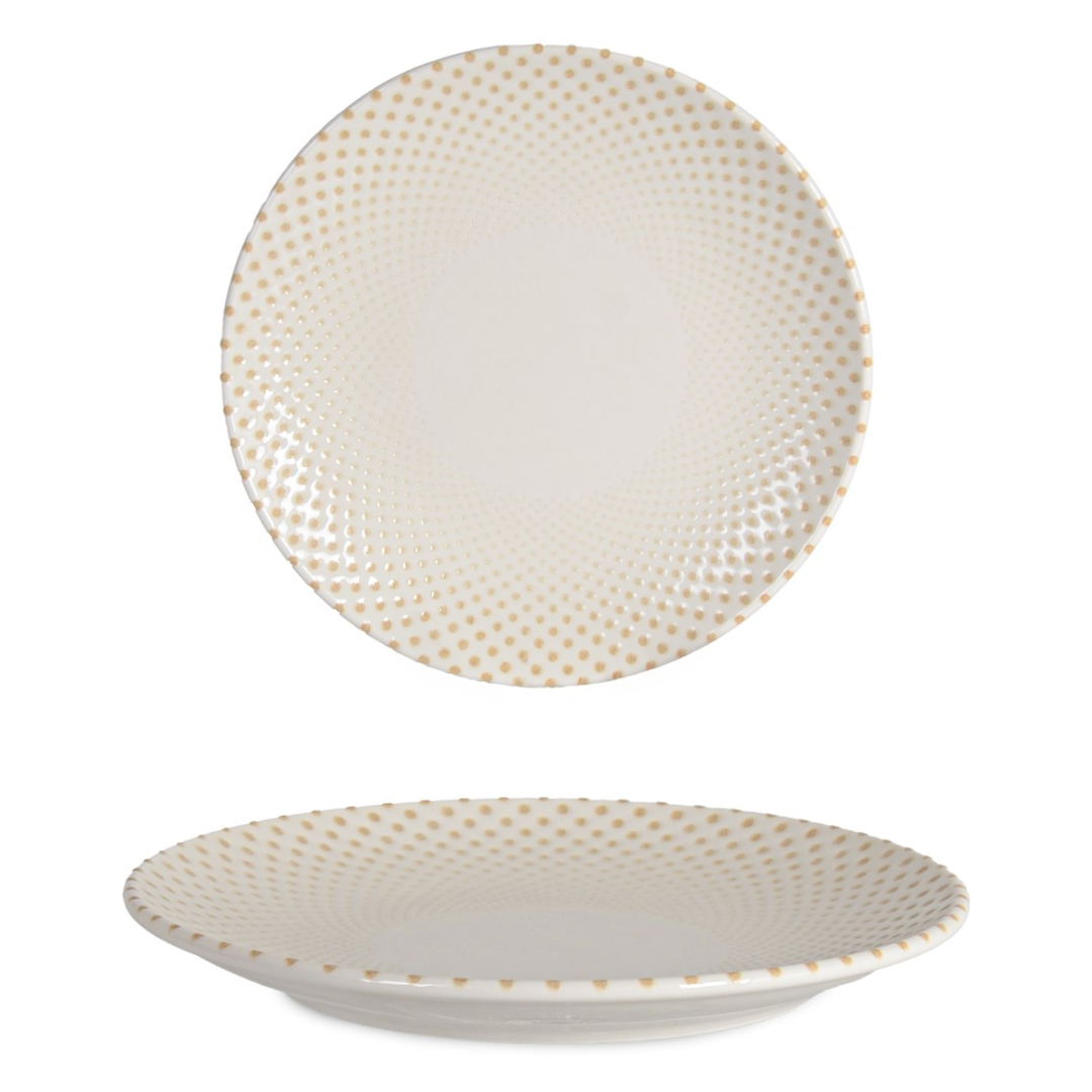 See on hele, neutraalsele valgele lähedane, peente dekoratiivsete täppidega.