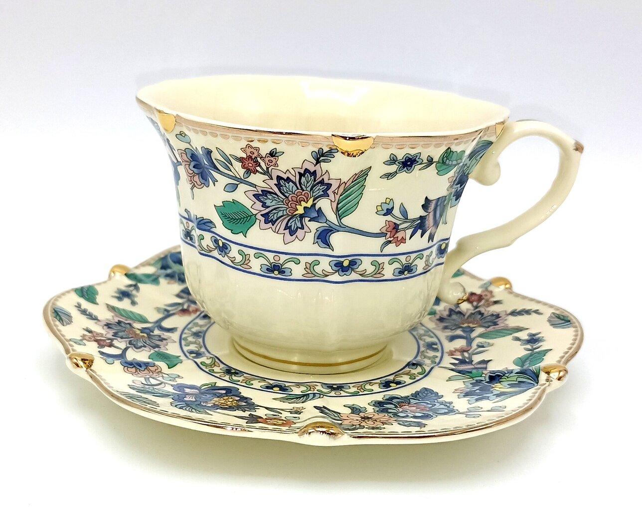 - Disain: Rikkalikud lillevärvid (domineerivad violetsed ja roosakad toonid) sobivad suurepäraselt kreemja portselani taustaga. Luksusliku mulje lõpetab peen kuldne viimistlus äärtes ja sangadel.