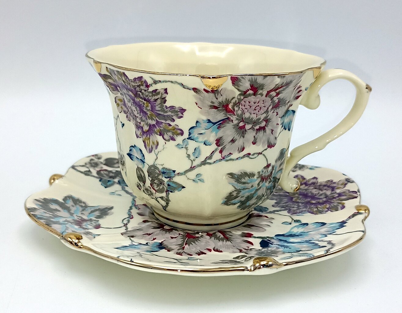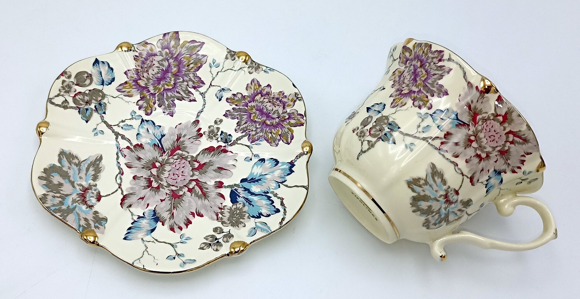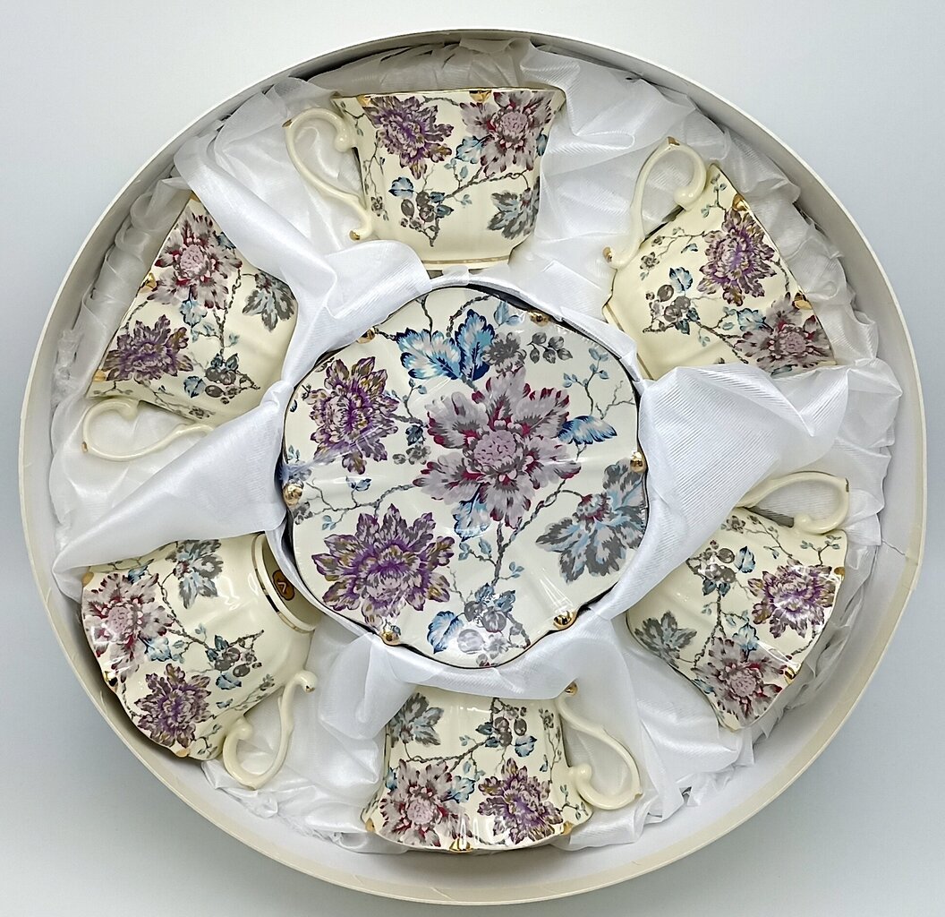 - Disain: Nõud on kaunistatud peente, pastelsete õitega (domineerivad violetsed ja sinakad toonid), mis tulevad kreemjal taustal peenelt esile. Lainelised ääred, mis on kaunistatud kuldse äärisega, ja elegantsed sangad annavad komplektile klassikalise sarmi.