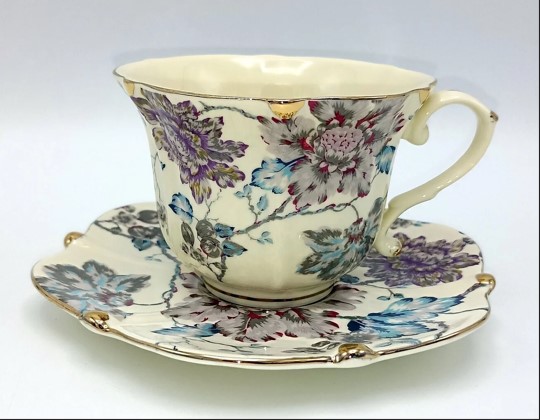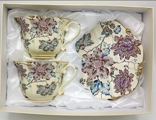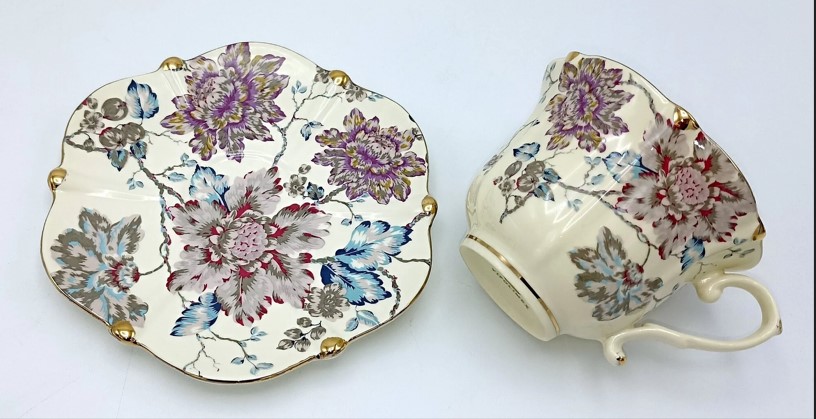 - Disain: Sooja kreemjat tausta kaunistavad elegantsed värvilised lilled. Tasside ja alustasside ääred on lainelised ja kaunistatud luksusliku kuldse triibuga, mis annab nõudele vintage sarmi.