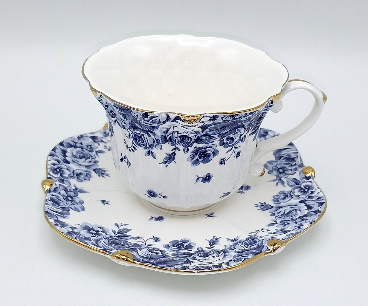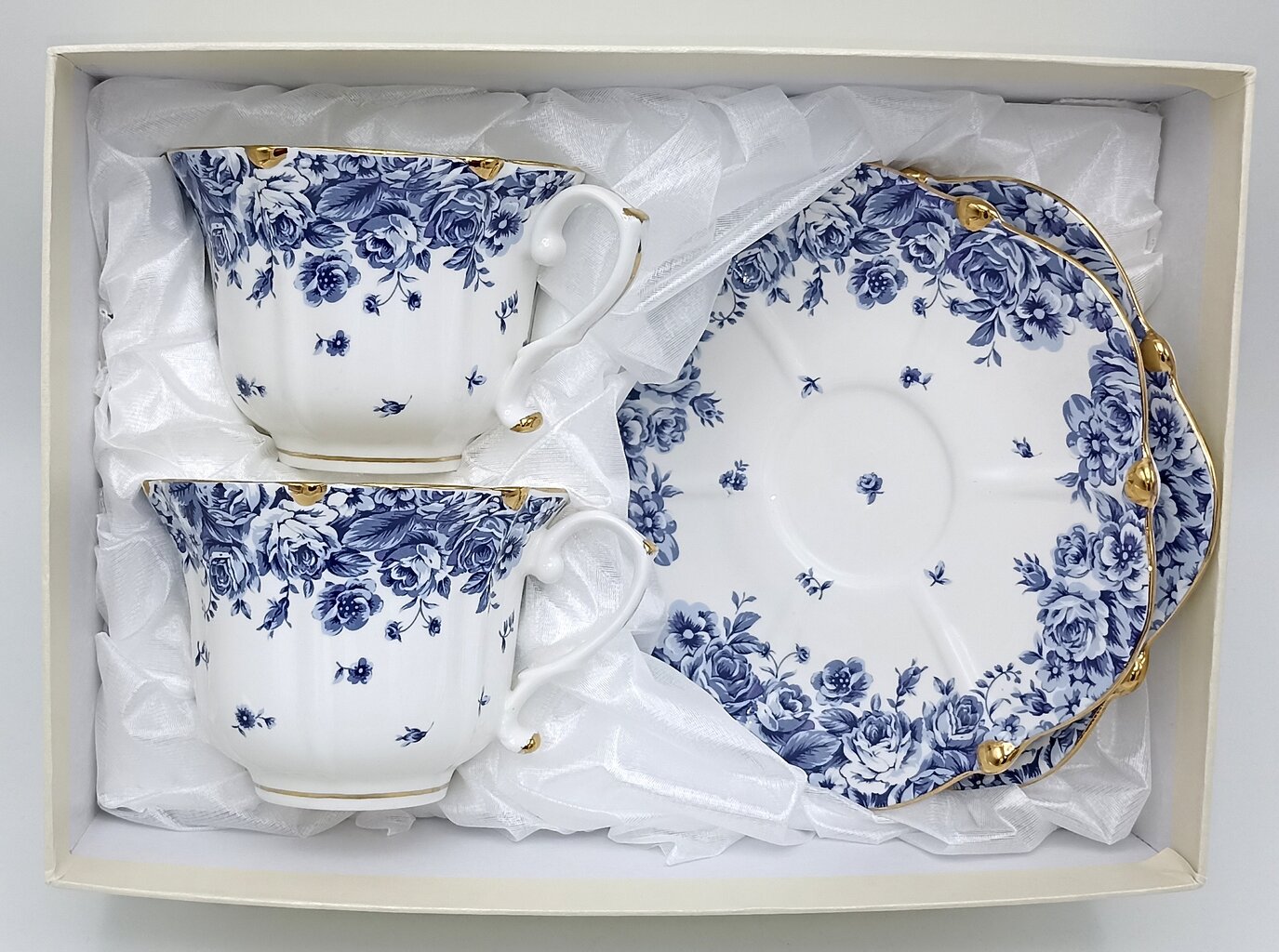 - Disain: Valget portselani kaunistab rikkalik siniste rooside ja lillede muster. Tasside ja alustasside ääred on lainelised ja kaunistatud luksusliku kuldse triibuga, mis annab nõudele aristokraatlikkust.