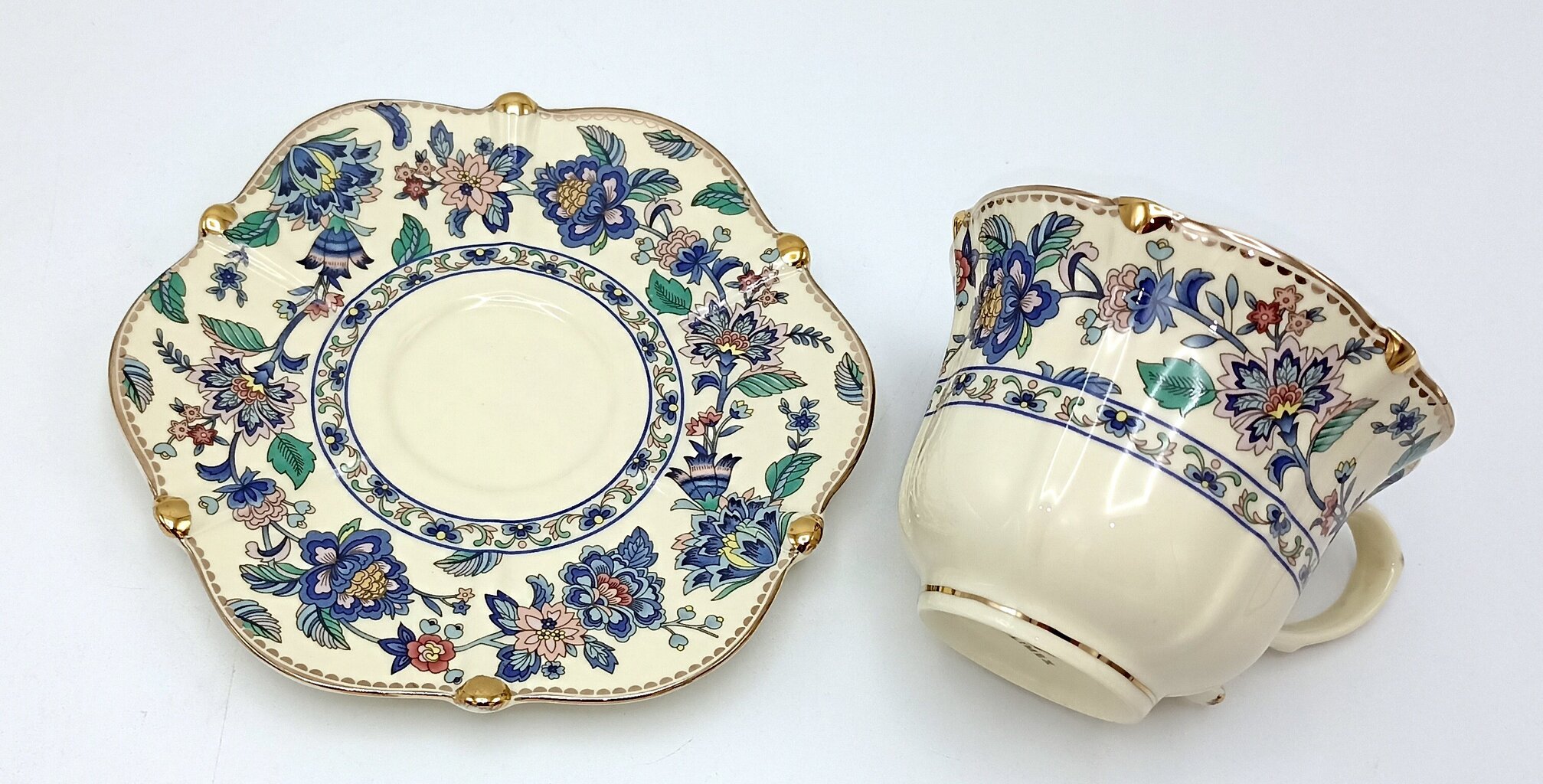 - Disain: Valget portselani kaunistab rikkalik siniste rooside ja lillede muster. Tasside ja alustasside ääred on lainelised ja kaunistatud luksusliku kuldse triibuga, mis annab nõudele aristokraatlikkust.