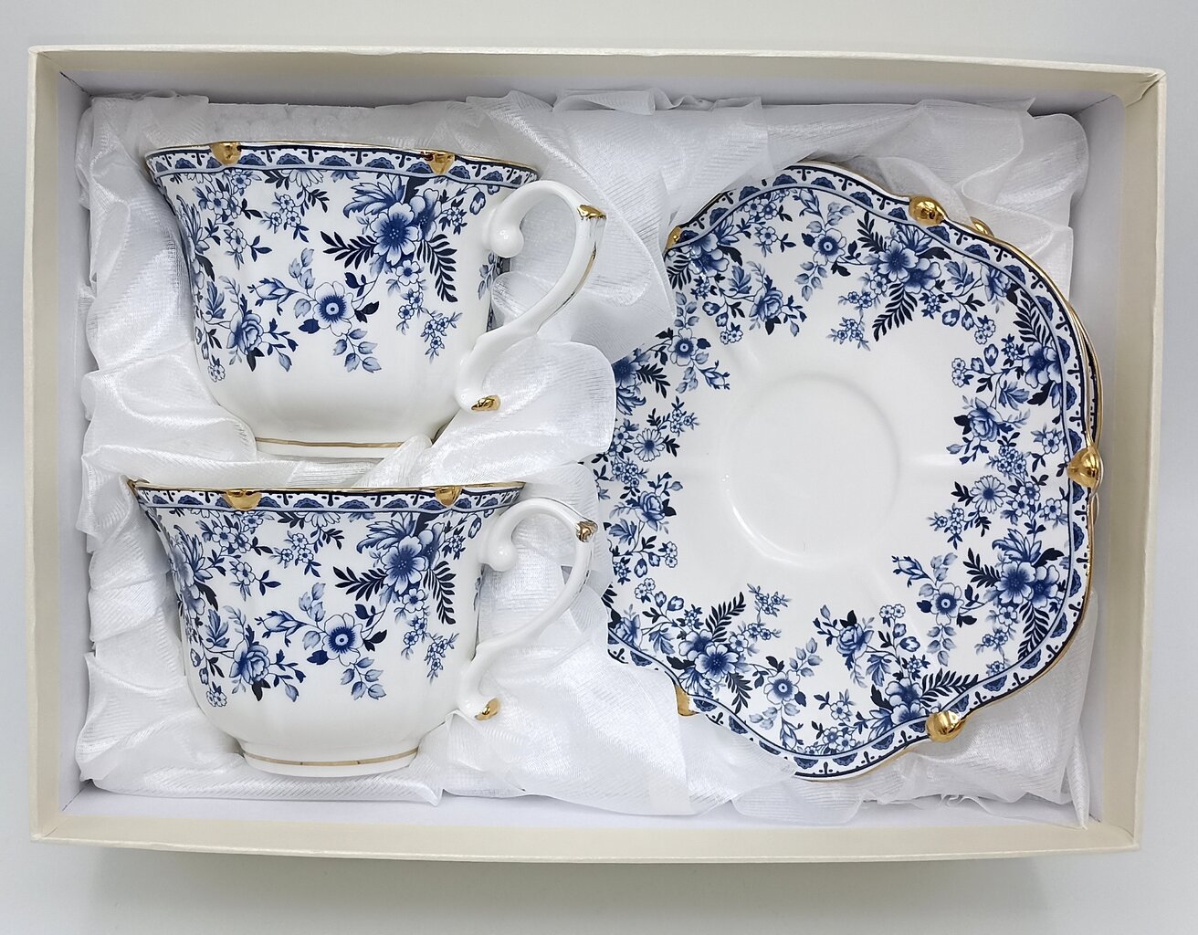 Portselanist tasside ja alustasside komplekt, 2 tk (sinised õied, kinkekarbis)