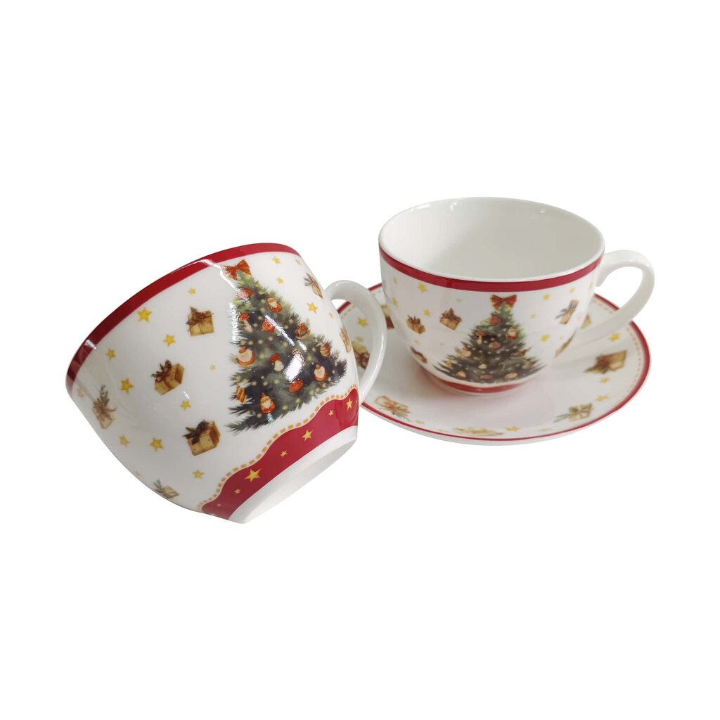 Kogege tõelist jõuluvaimu selle elegantse kahe tassi ja alustassi komplektiga. Traditsiooniline jõulupuu, mida ümbritsevad säravad kuldsed tähed ja kingitused, toob teie koju soojust ja hubasust.