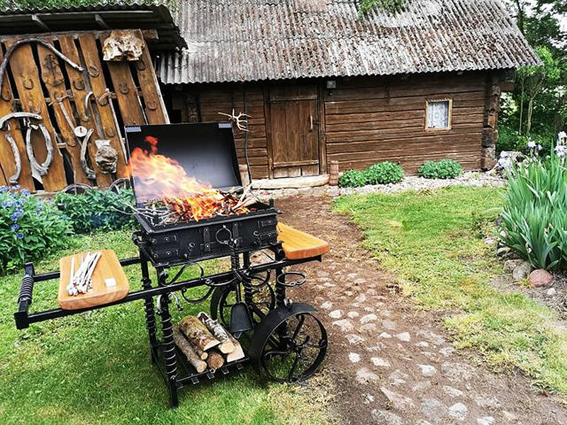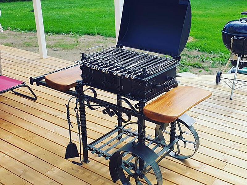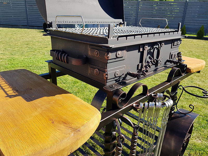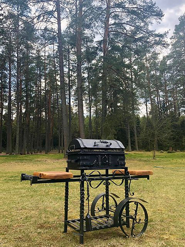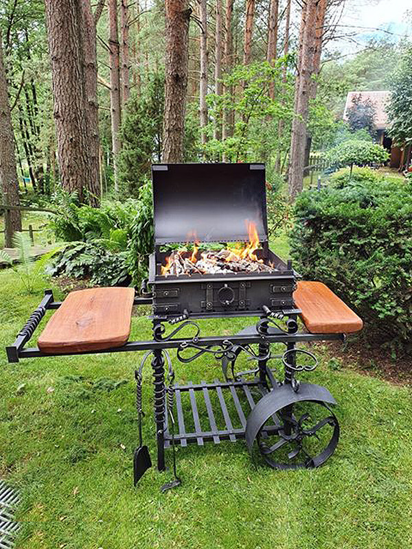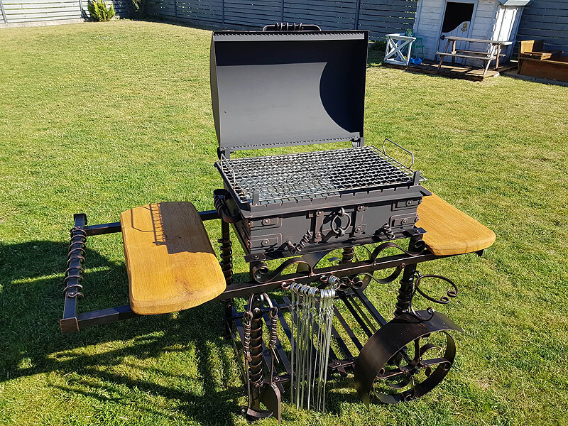 Ratastel liikuv šašlõkkgrill. Allos metallist riiul mõõkade hoidmiseks, ülal mugavad puidust riiulid. Grillil on kaas ja tõstetav põhi, mis võimaldab reguleerida temperatuuri ja küpsetada toite kiiremini ja ühtlasemalt.
