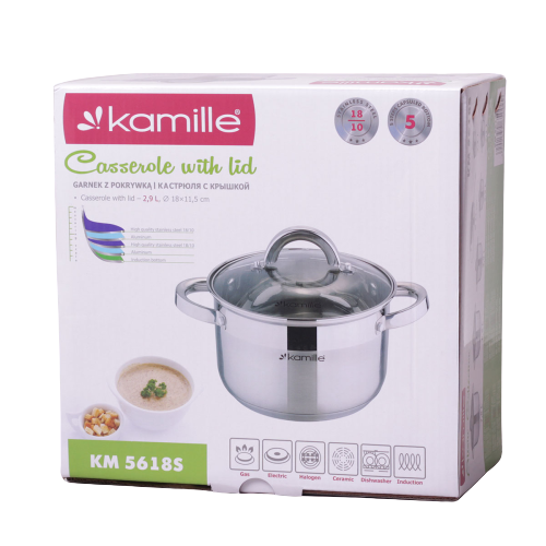 See 2,9-liitrine „Kamille“ pott on loodud kaasaegse köögi jaoks, ühendades vastupidavuse ja elegantse disaini. Valmistatud kvaliteetsest 18/10 roostevabast terasest, tagab see maksimaalse hügieeni ja korrosioonikindluse.