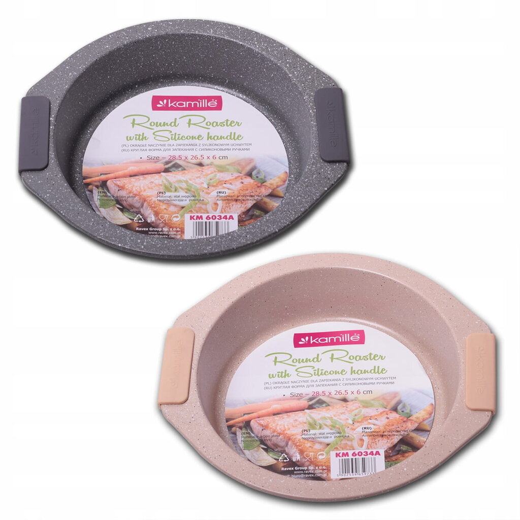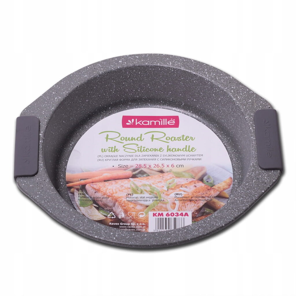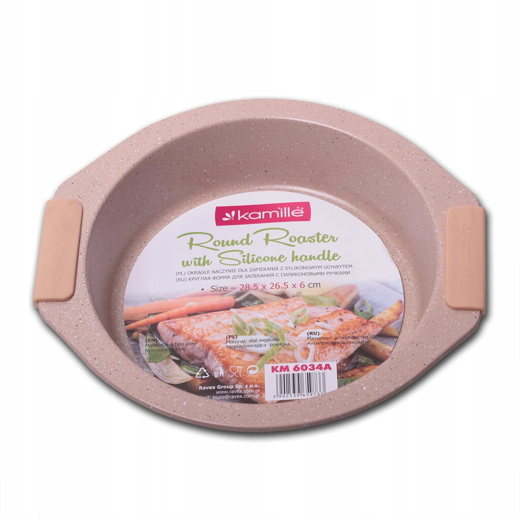 See “Kamille” küpsetusvorm ühendab endas süsinikterase ajaproovile vastu pidanud tugevuse ja uuendusliku marmorkatte. See on ideaalne nõu kookide, vormiroogade, liha- või köögiviljaroogade valmistamiseks. Tänu optimaalsele suurusele (28,5 x 26,5 cm) ja sügavusele (6 cm) saab sellest vormist teie köögis asendamatu abimees.