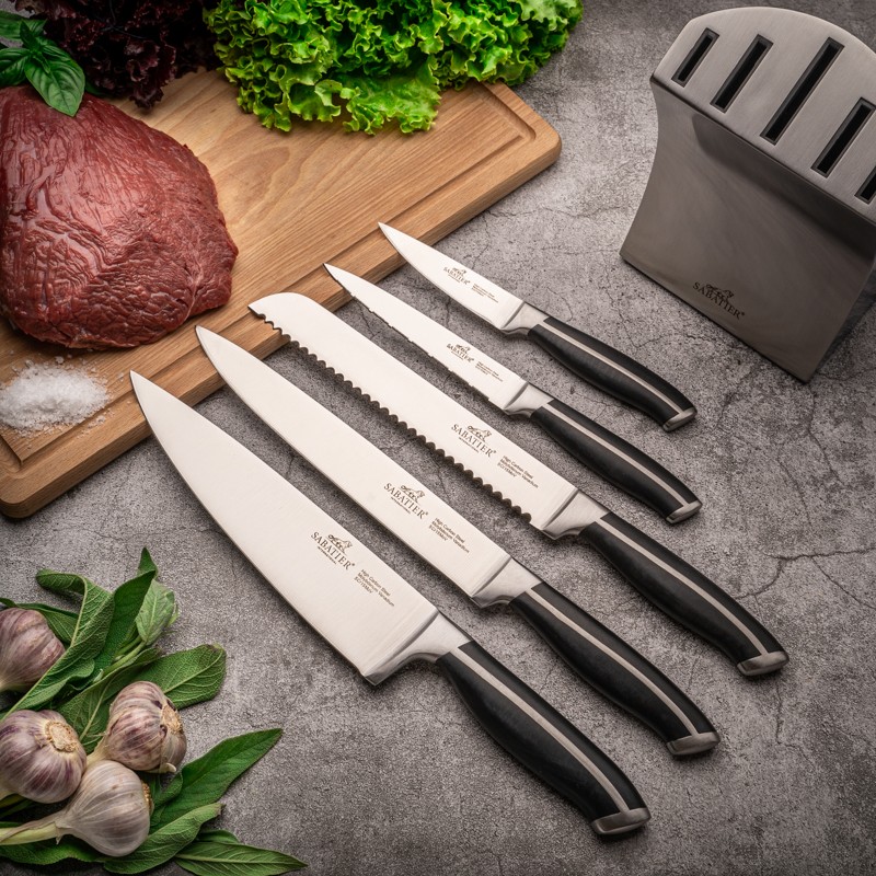Sabatier International 5 kööginoa komplekt koos alusega on suurepärane võimalus varustada oma köök kvaliteetsete noadega taskukohase hinnaga! Kõige olulisemate kööginoakomplekt võimaldab teil lõigata igasugust toitu, samal ajal kui mugav noatugi annab teie köögile elegantsi ja kaasaegsust. Hoidke oma noad originaalselt ja rafineeritult!