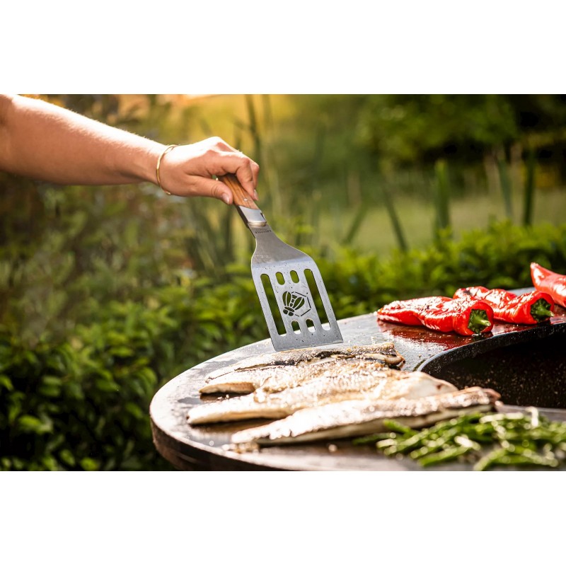 “Spatel XL BBQ Forged” on kvaliteetne, käsitsi valmistatud spaatel, mis on mõeldud grillihuvilistele, kes soovivad tagada maksimaalse täpsuse ja mugavuse grillimisel. Valmistatud kõrgeima kvaliteediga materjalidest, ei ole see spaatel mitte ainult funktsionaalne, vaid ka elegantne.