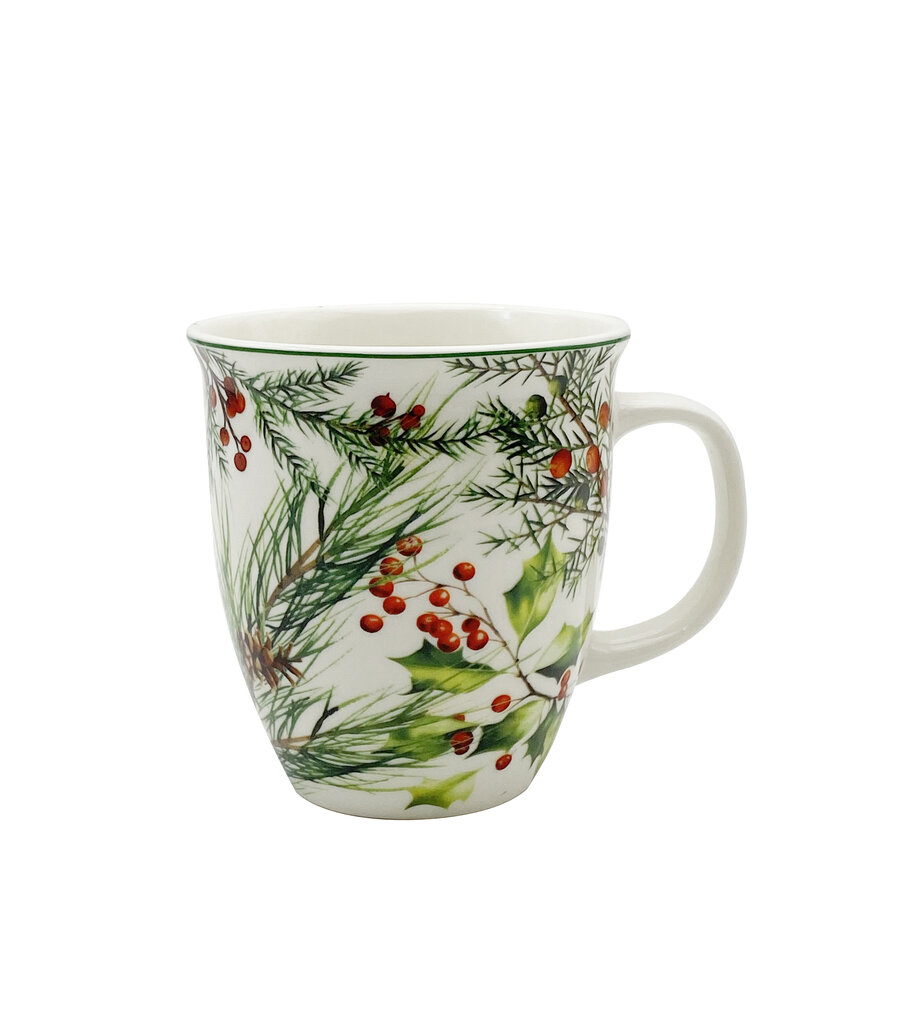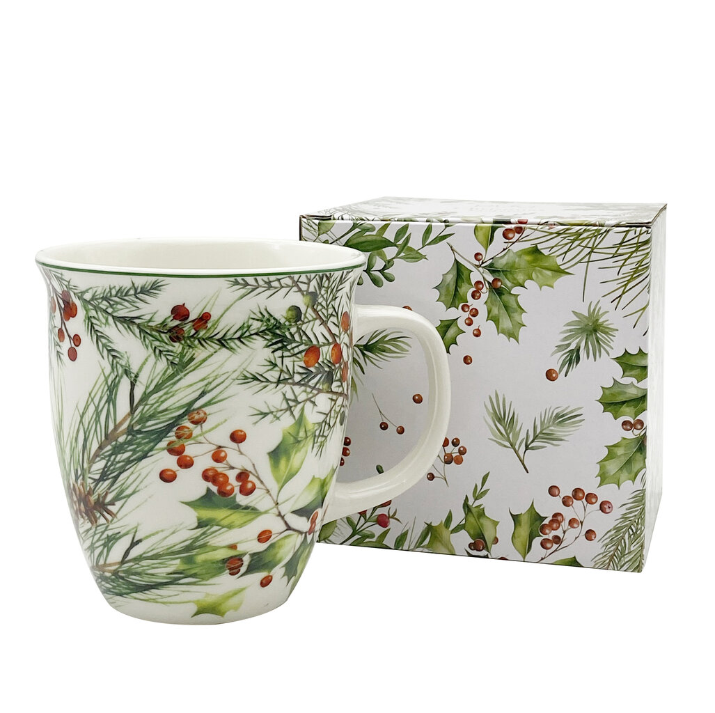 - Talvine disain: Kruusi kaunistab ere ja loomulik muster: põimunud rohelised kuuse- ja iileksioksad punaste marjadega. See loob piduliku, metsahõngulise atmosfääri.