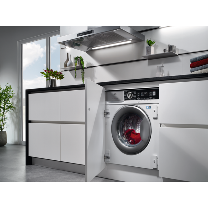 Looge ühtne ja harmooniline interjöör täielikult integreeritava pesumasin-kuivatiga AEG 7000 seeriast. See seade on mõeldud kappi paigaldamiseks ja mööbliuste taha peitmiseks, nii et teie köögi või vannitoa disain jääb laitmatult puhtaks. See töötab vaikselt ja hoolitseb igakülgselt ka kõige õhemate kangastega rõivaste eest, pestes ja kuivatades need ühe tsükliga.