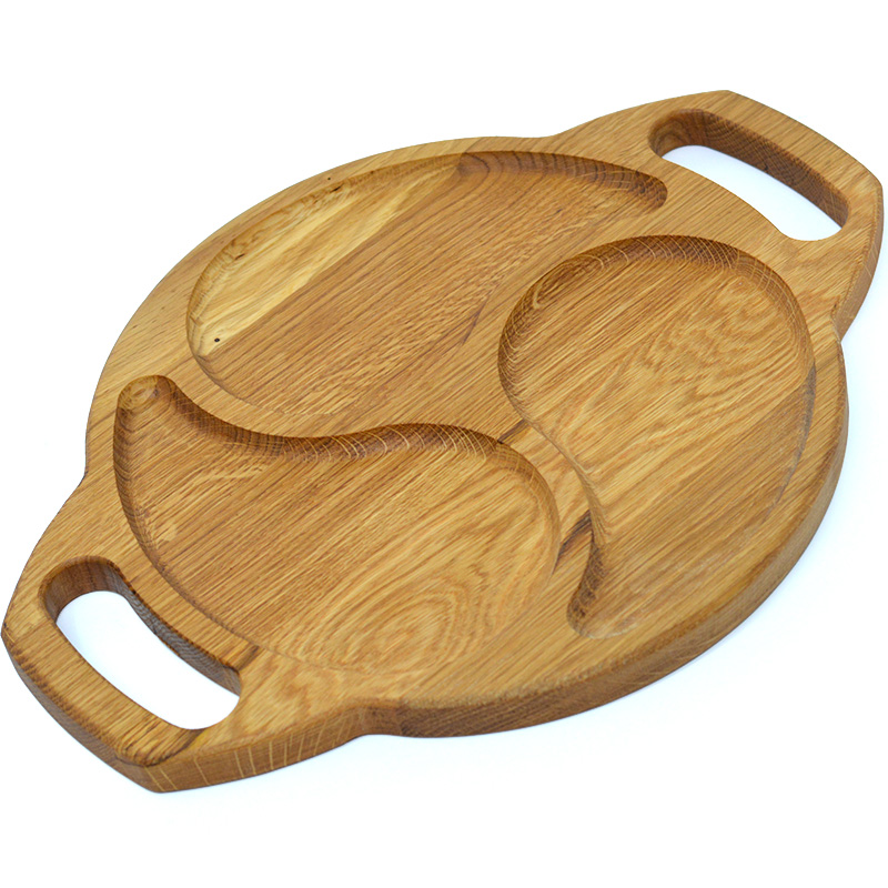 Kvaliteetne tammest serveerimisalus mugavate käepidemetega ja mitme vaheseinaga. Ideaalne suupistete, puuviljade, juustude ja teiste hõrkude serveerimiseks. Tänu oma naturaalse puidu tekstuurile ja erilisele disainile saab sellest alusest teie laua kaunistus.