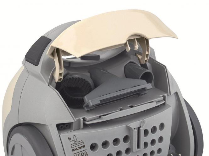 - Kas tarvikuid on mugav hoiustada? Jah, tolmuimeja korpuses on spetsiaalne sektsioon väiksemate otsikute hoidmiseks, nii et need on alati käepärast.