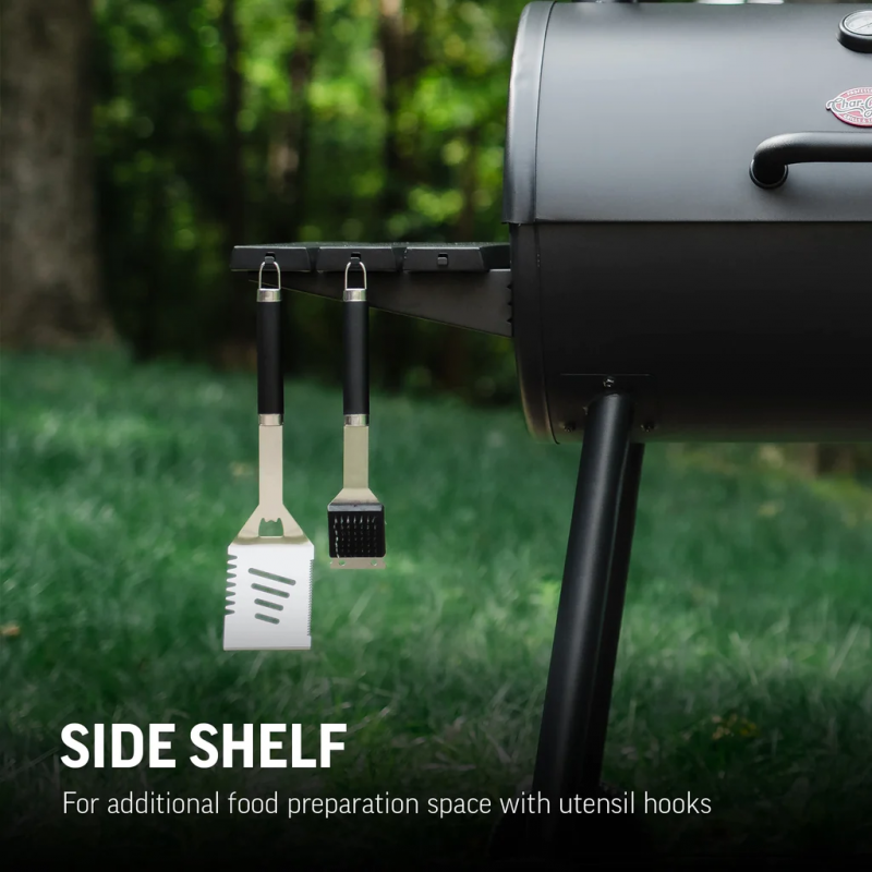 Teie mugavuse huvides on olemas küljeriiul, mis toimib käepidemena, kui soovite grilli transportida. Riiuli mugavatele konksudele saate riputada oma lemmikgrillimistarvikud. Eesmine riiul on kasulik millegi asetamiseks, nagu glasuuri jaoks kastme või taldriku toidu serveerimiseks.
