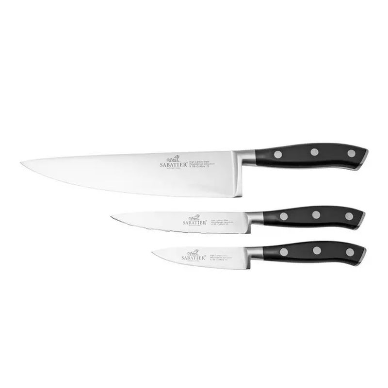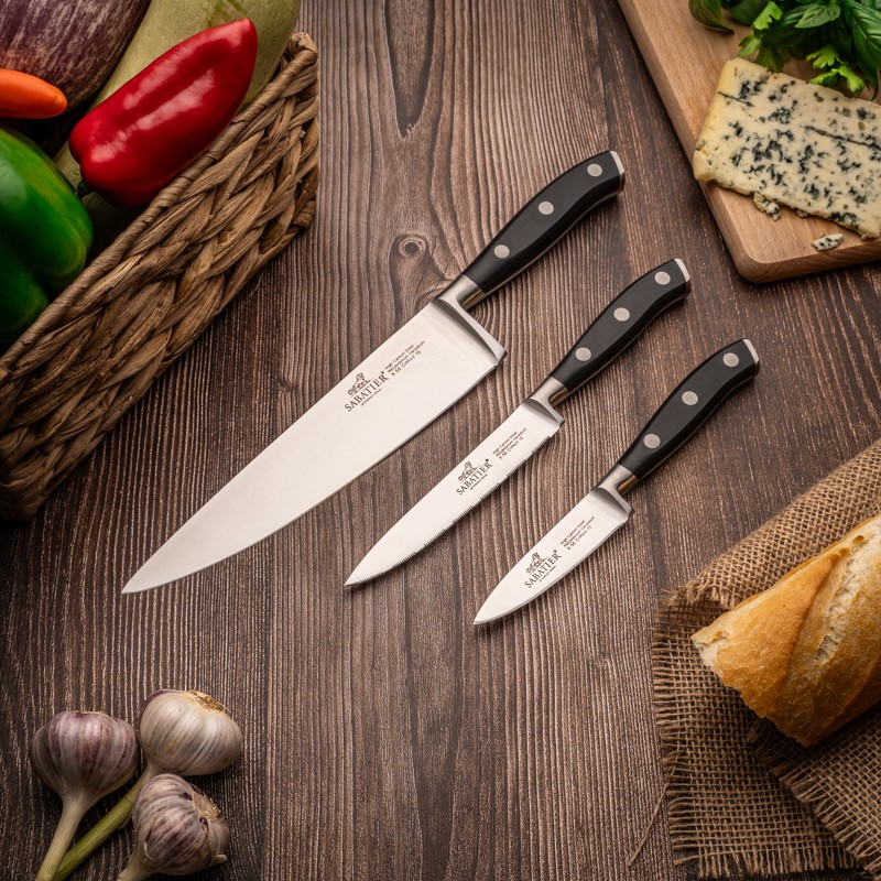 Olenemata sellest, kas olete professionaalne kokk või naudite lihtsalt toiduvalmistamist, on Sabatier® Internationali noad ideaalne valik. See 3-noakomplekt sisaldab 9 cm teraga puu- ja juurviljade koorimisnuga, 13 cm teraga sakilise tarbenuga ja 20 cm kokanuga. Noad on valmistatud roostevabast terasest X40Cr13. See on teras, mis säilitab oma teravuse kaua ja mida on lihtne teritada. Tugev ja töökindel noa käepide on valmistatud ABS-plastikust koos 3 roostevabast terasest neediga. Need noad on mõeldud kasutamiseks igas köögis ja tagavad teile kindlasti aastatepikkuse kasutusea.