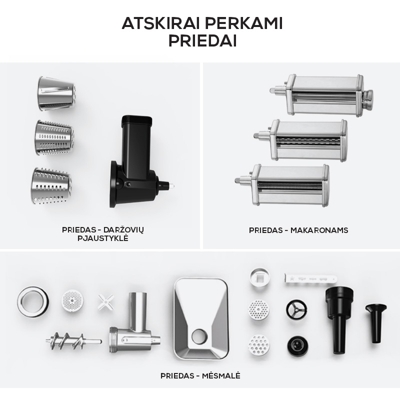 ✅ Võimalus osta lisatarvikuid (lihamasin, pastavalmistamise tarvik, viilutaja-riiv).